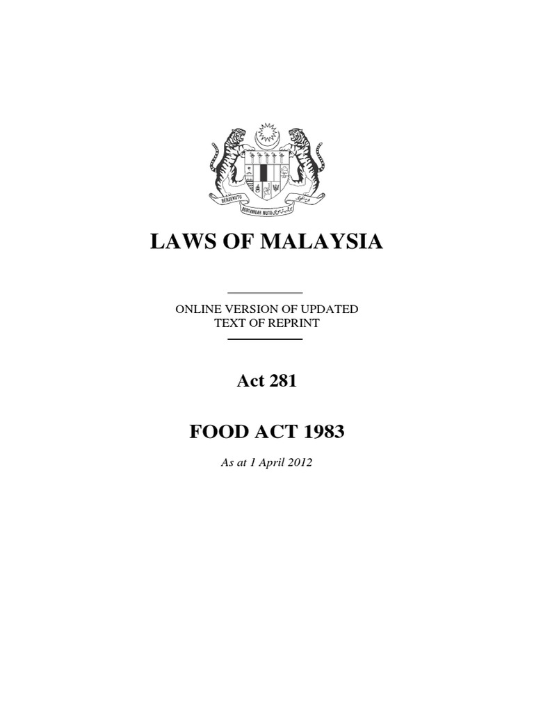 Related : Malaysia Food Act 1983 : This is an act to provide for the protection of the public against health hazards and fraud in the preparation, sale and use of food..