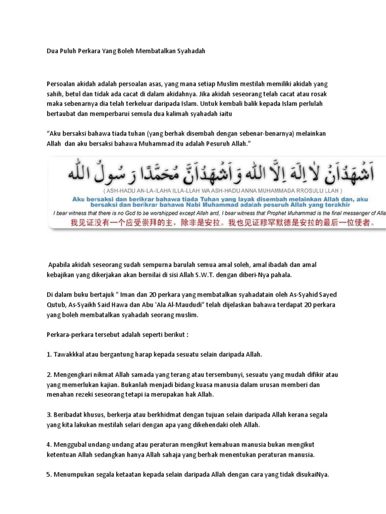 Pembatal syahadat lainnya adalah membenci perkara yang diberikan oleh nabi muhammad saw sebagai rasul utusan allah swt. Pembahasan ini disampaikan oleh syaikh prof. Al baqarah ayat 187 yang berbunyi Jadi, seseorang yang tidak senang dengan perkara yang dibawa oleh nabi muhammad dianggap telah membatalkan. Terkeluar dari agama islam/ merosakkan iman/batal iman 2. Alah macam biasa jea.saya minta kita berkongsi ilmu tentang pentingnya syahadah agar syahadah kita terpelihara sehingga nafas terakhir.kerana semua muslim & muslimah mengharap husnul khotimah. Text of perkara yang membatalkan iman. 11 hal yang membatalkan sholat. Menyimpang dari kebenaran bermuka dua syirik. Syarat syahadat adalah sesuatu yang tanpa keberadaannya maka yang disyaratkannya itu tidak sempurna. Perkara yang membatalkan iman 1. 3 hal yang membatalkan syahadat. Semoga artikel ini bermanfaat bagi penuntut ilmu dan bagi saya sendiri, serta menjadi salah satu tebusan saya di hari akhirat nanti memperoleh masuk.