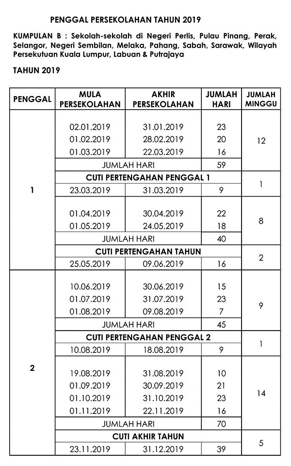 Kuala lumpur, labuan & putrajaya. Berikut adalah jadual cuti persekolahan yang mengandungi tarikh cuti sekolah untuk cuti pertengahan penggal 1, cuti pertengahan tahun dan cuti. Takwim persekolahan ini terbahagi kepada 2 kumpulan : Takwim penggal persekolahan 2019 ini dibahagikan kepada dua iaitu kumpulan a dan b. Penggal persekolahan tahun 2019 kumpulan a :