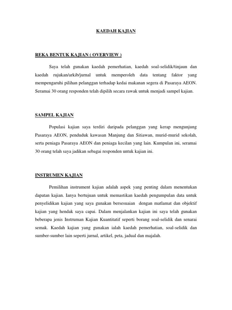 Objektif kajian ini ialah menganalisis campuran produk berdasarkan perbandingan. Nov 25, 2015 · contoh kerja kursus pengajian perniagaan tingkatan 6 penggal 3 2015 (stpm) ( kfc malaysia ). 2 0 objektif kajian 2 3 0 latar belakang lokasi kajian 3 4 0 kaedah kajian 8 12 4 1 data primer 4 1 1 temubual 4 1 2 soal selidik 4 1 3 pemerhatian 4 2 data sekunder 4 2 1 buku rujukan 4 2 2 laman sesawang 4 2 3 majalah. Syarikat ini lebih dikenali sebagai ***** beauty. Kaedah kajian merujuk kepada cara yang digunakan oleh pelajar untuk memahami situasi, menyelesaikan masalah dan juga mengenalpasti sesuatu isu.